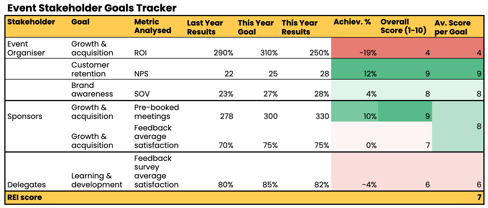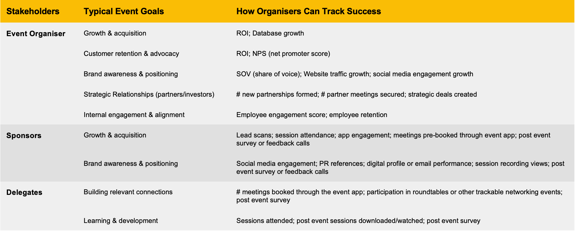 Here are just some examples of typical event goals by stakeholder and metrics you could choose to help you track towards your goal’s success 👇