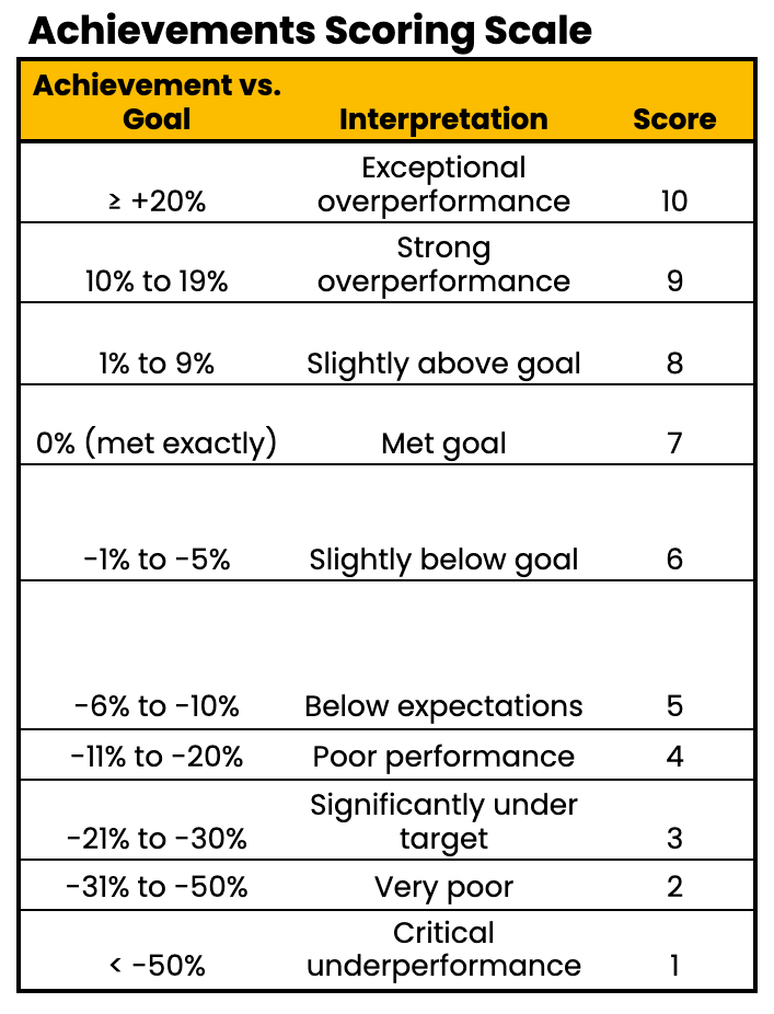 You can then assign each goal a score (1–10) based on a specific scoring scale logic like the one below to help you visualise performance at a glance: